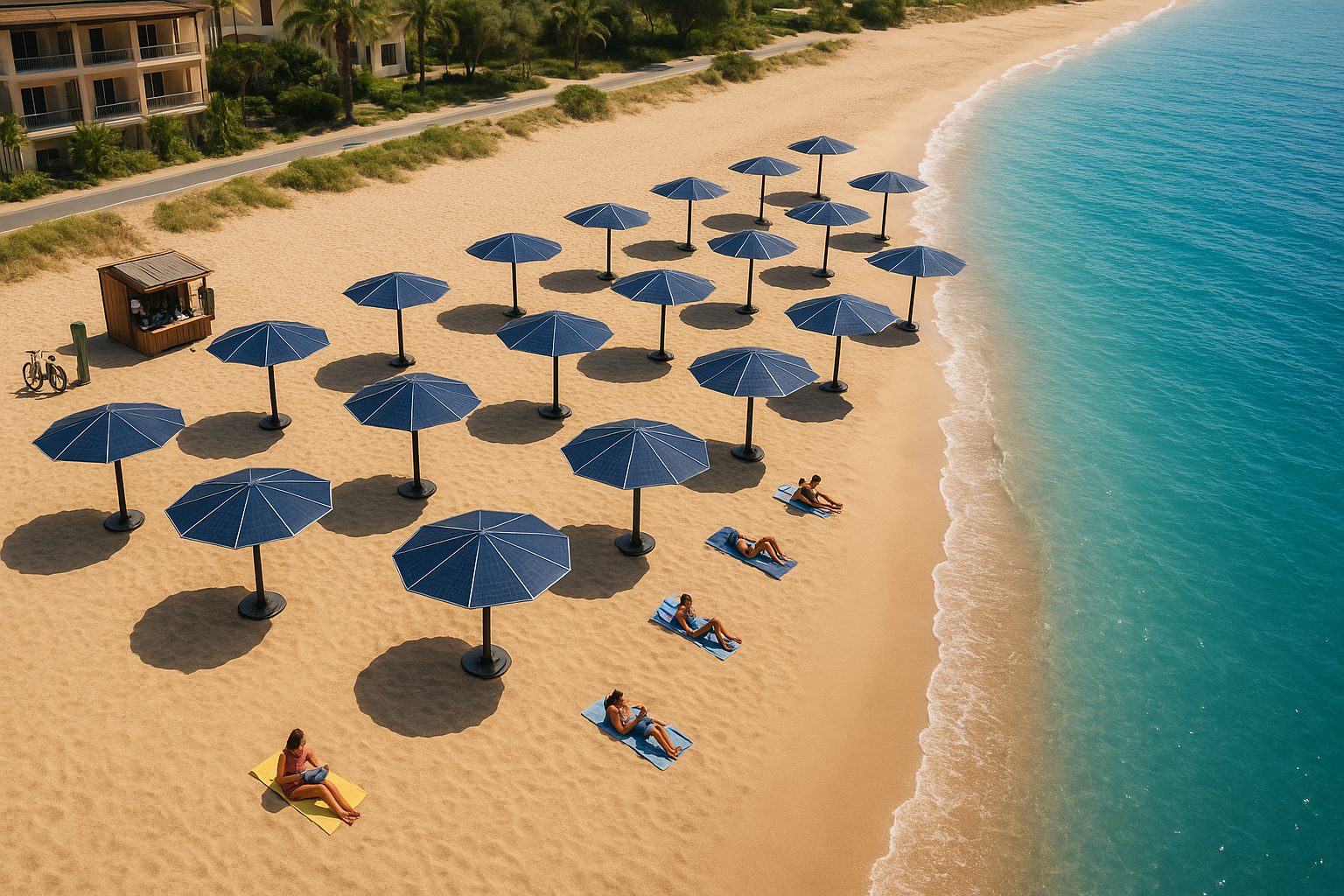 A Mediterranean beach dotted with solar umbrellas providing shade, cooling, and clean energy for light EVs and beach cafés.