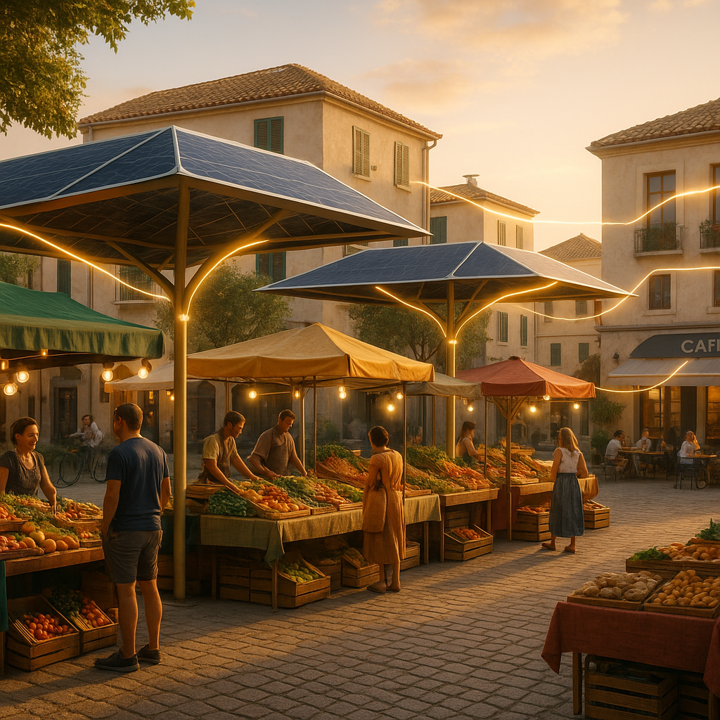 A Mediterranean market shaded by solar canopies — powering food stalls, coolers, and community energy exchanges.