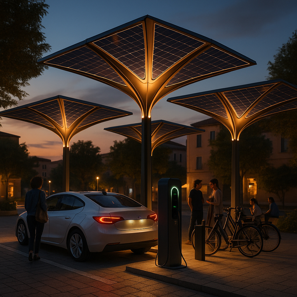 A solar-powered mobility hub — clean charging, comfort, and shade for the cities of tomorrow.